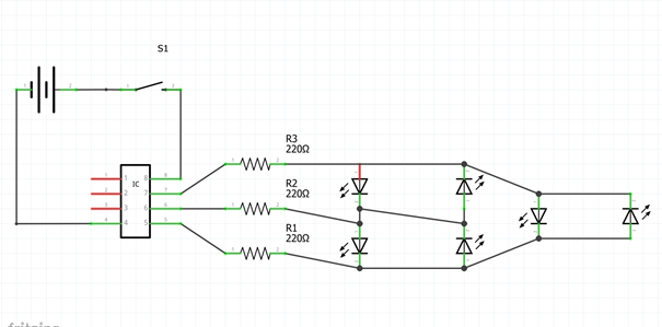 Mijn pcb design is gebaseerd op het simpele schema onderaan. Ik heb dit schema nagetekend in Fritzing. Nadat ik dit schema getekend had ging ik de componenten plaatsen in mijn pcb design. Ik heb ook een batterijhouder erbij gedaan en ook een schakelaar om de LED's aan en uit te zetten