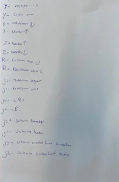 Met dit blaadje kon je kijken in het besturings programma welke knop je in moest drukken om de robot de juiste kant op te laten gaan