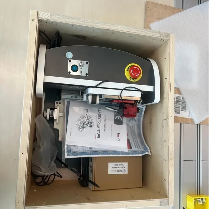 Tijdens de les kregen we een interessante en leuke taak toegewezen: het uitpakken en klaarmaken van een Wegstr CNC-machine voor gebruik. Het was erg interessant om met deze CNC machine te werken.