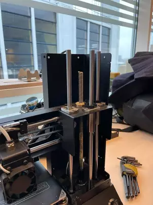 We kregen de opdracht om de Wanhao i3 mini printer klaar te maken voor gebruik. direct merkten we dat er veel speling zat in de assen. We haalden de kappen van de assen af met een inbussleutel en constateerden dat de assen niet aan de bovenkant vast waren gemonteerd. Dit veroorzaakte problemen bij het soepel bewegen van de printer. Bij verder onderzoek bleek dat de assen zonder weerstand uit de lagers konden worden gehaald, wat een teken is dat de lagers van slechte kwaliteit zijn. We hebben ook op internet ontdekt dat veel andere gebruikers van deze printer problemen hebben met de lagers. We moeten een oplossing vinden voor dit probleem om de printer geschikt te maken voor gebruik. Ook zaten er bepaalde onderdelen niet goed vast.
